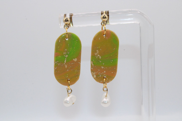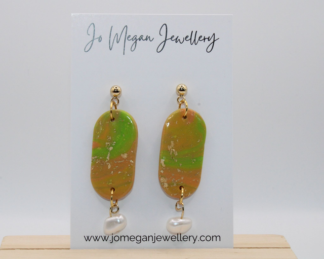 Oval earrings in green+orange with gold accents. Lightweight, hypoallergenic earrings handmade from polymer clay.