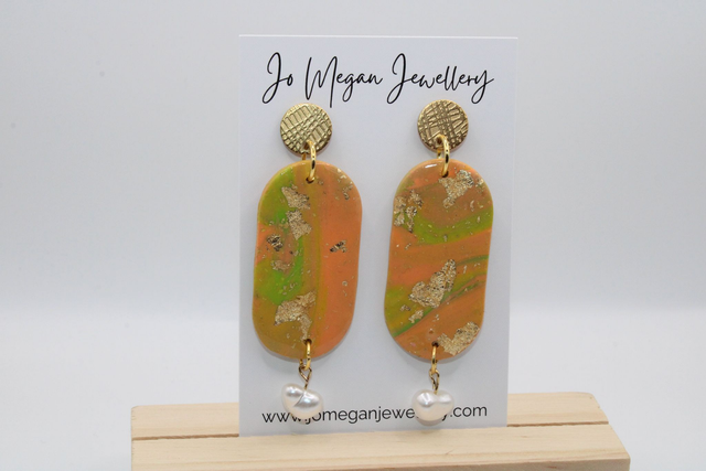 Oval earrings in green+orange with gold accents. Lightweight, hypoallergenic earrings handmade from polymer clay.
