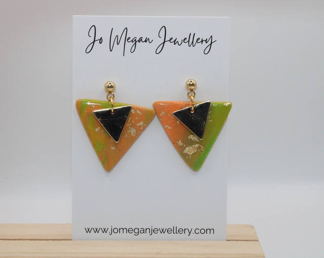 Tríona earrings in green+orange with gold accents. Lightweight, hypoallergenic earrings handmade from polymer clay.